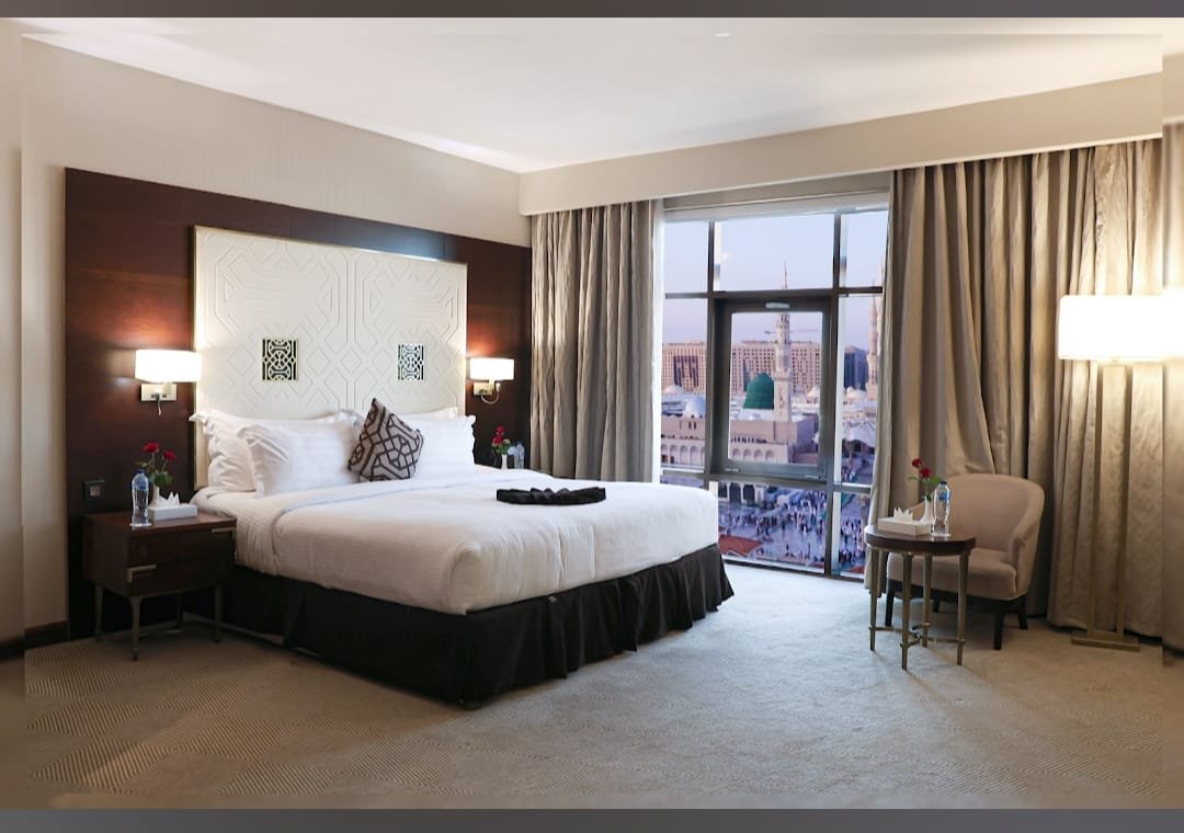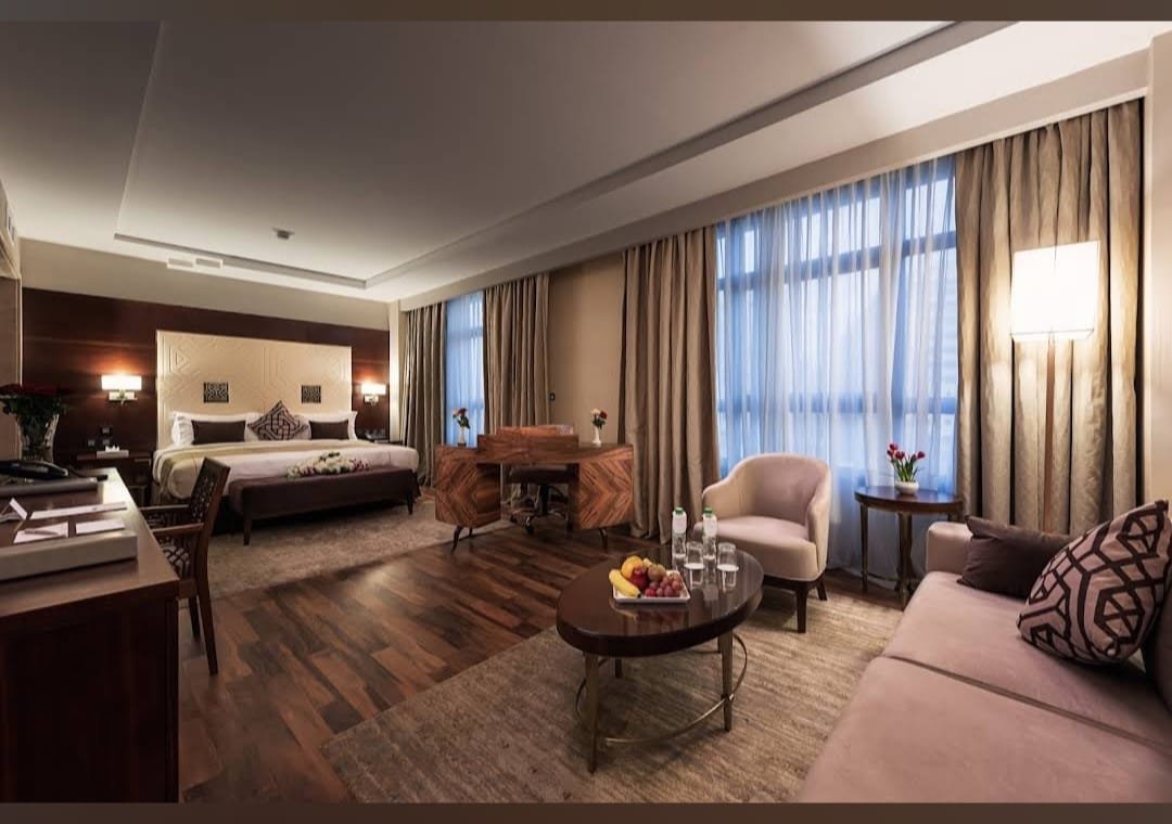Step into elegance and comfort with Rua Al Hijrah Hotel’s thoughtfully designed rooms and suites that cater to every need. Each space is equipped with air-conditioning, high-speed internet, luxurious bedding, and en-suite bathrooms to ensure you feel at home. Guests can also enjoy additional facilities, such as 24-hour room service, prayer area accessibility, and a welcoming concierge team always ready to assist.